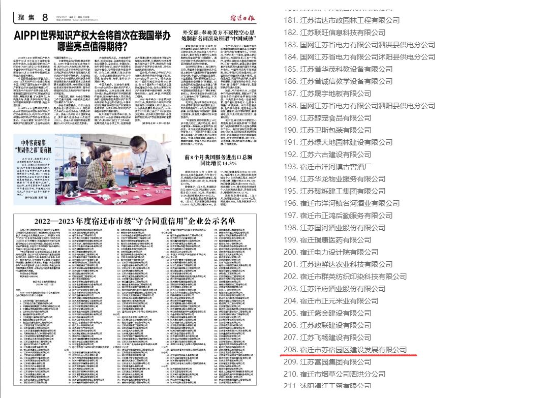 近日,宿遷市企業(yè)信用管理協(xié)會發(fā)布2022-2023年度宿遷市市級“守合同重信用”企業(yè)名單公示,建發(fā)公司再度榮列企業(yè)公示名單。